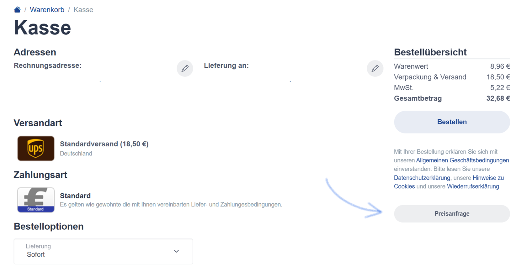 Im Warenkorb gehen Sie den Prozess bei "Zur Kasse" durch, bis Sie in der Bestellübersicht unten rechts den Button "Preisanfrage" sehen.